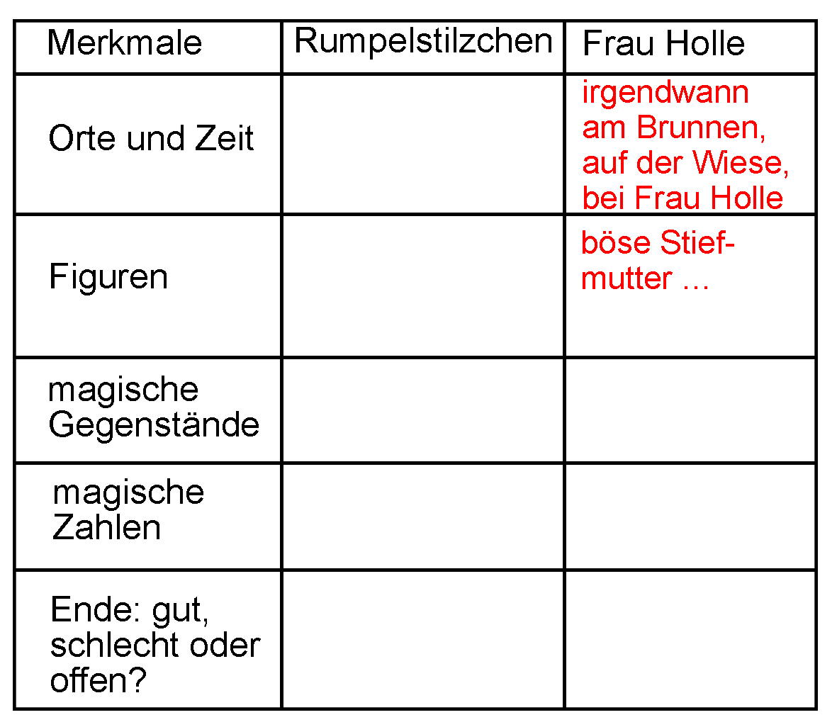 6. Wähle ein dir gut bekanntes Märchen aus und liste seine Merkmale in einer Tabelle auf! Stelle der Klasse deine Ergebnisse vor! Welche Merkmale findet ihr am häufigsten vor?