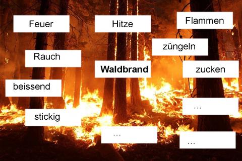 1. Versetze dich in die Situation auf dem Bild „Waldbrand“. Schreibe auf, was du siehst, hörst, fühlst und riechst!