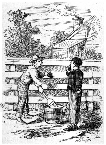 Und während der frühere Dampfer „Großer Missouri“ im Schweiße seines Angesichts drauflos strich, saß der zurückgetretene Künstler auf einem Fässchen im Schatten dicht dabei, baumelte mit den Beinen, verschlang seinen Apfel und brütete über dem Gedanken, wie er noch mehr Opfer in sein Netz zöge. An Material dazu war kein Mangel. Jungen kamen in Menge vorüber. Sie kamen, um zu spotten und blieben, um zu tünchen!
