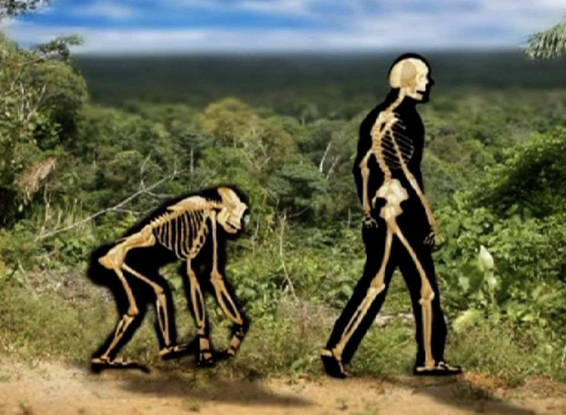 Der Körperbau der Menschenaffen ist dem des Menschen recht ähnlich, was ein Vergleich der beiden Skelette von Schimpanse und Mensch gut zeigt: Die Gliedmaßen haben den gleichen Bauplan: Die Arme sind jedoch beim Schimpansen viel länger, sie reichen in gebückter Stellung des Tieres bis zum Boden. Die langen Finger ermöglichen eine Fortbewegung auf den Knöcheln und das Klettern in den Bäumen.